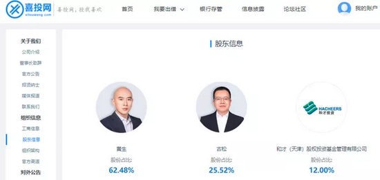 根据喜投网官网上的信息显示,其第一大股东为知名财经大V黄生,持股62.48%;自然人古松持股25.52%,为第二大股东;和才(天津)股权投资基金管理有限公司持股12%,位居第三大股东行列。