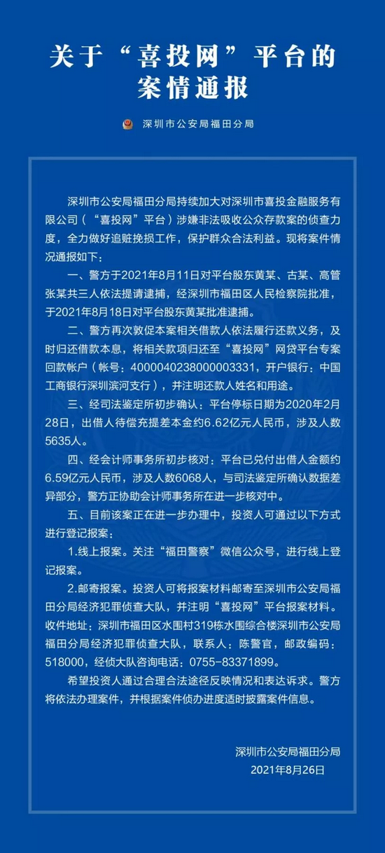 8月26日,深圳市公安局福田分局发布关于喜投网”平台的案情通报。