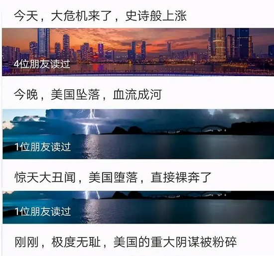 在他的微信公众号上上,美国简直成了“人间地狱”,股市“崩盘”,社会“崩溃”,战争“一触即发”……这些文章,迎合了部分读者的心理需求,可以笼统称之为“爱国爽文”。