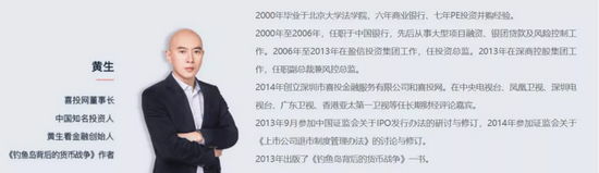 根据喜投网网站的介绍,黄生拥有六年商业银行、七年PE投资并购经验,曾任职金融机构,长期在多家电视台任财经评论嘉宾。