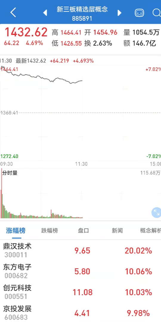创新层表现更为激烈,钢宝股份一度上涨100%,康远股份、飞企互联、华西易通涨幅超90%,埃文低碳、中科水生等近20股涨幅超50%,另有中成发展、灵鸽科技等近40股涨幅超20%。创新层个股成交也是大幅增加,逾70股量比超10倍。基础层仅涨幅100%的个股就多达9只,分别是达晖生物、迅美节能、摘牌永平、麦迪制冷、摘牌泰谷、ST点点客、润和催化、鑫聚光电、金科环保,另有逾10股涨幅在50%—100%之间。