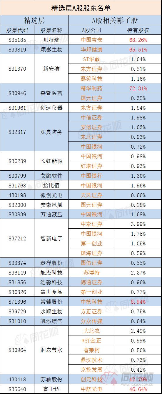 在参股新三板企业的上市公司方面,据同花顺数据统计,目前66家精选层企业,30家A股上市公司以直接或者间接的方式参与投资,包括子公司间接投资等,其中券商占据大多数。