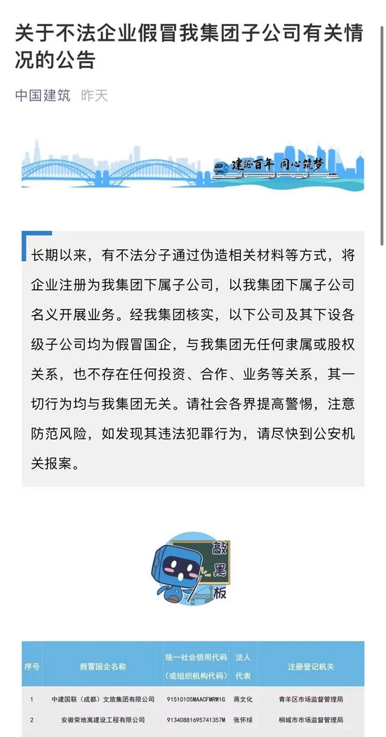 近期,部分中央企业对外公告了一批假冒国企名单,明确有关公司及其下设各级子公司均为假冒国企,与中央企业无任何隶属或股权关系,也不存在任何投资、合作、业务等关系,其一切行为均与中央企业无关。