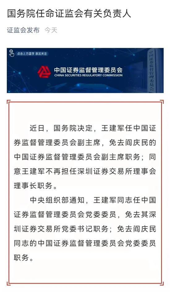 按照公告,任命王建军为中国证券监督管理委员会副主席;免去阎庆民的中国证券监督管理委员会副主席职务。
