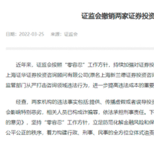 图为证监会发文称撤销两家公司投资咨询服务业务许可