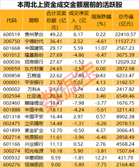 数据宝统计,本周共有28股登上北上资金成交活跃榜,所属行业来看,电气设备、食品饮料、银行行业买卖总额超过50亿元。本周多只银行股获北上资金净买入,包括平安银行、邮储银行、兴业银行,分别净买入5.02亿元、1.15亿元、0.52亿元。银行股中仅招商银行遭北上资金净卖出。