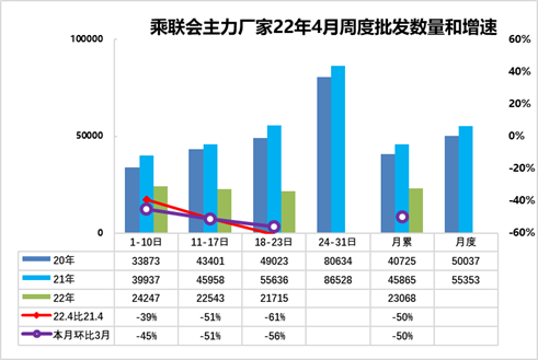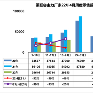 【2022年4月18日-23日乘联会市场分析要闻】4月18日-23日,乘用车批发13万辆,同比下降61%,环比上周下降4%,较上月同期下降56%。4月18日-23日,乘用车零售17.7万辆,同比下降46%,环比上周增长11%,较上月同期下降20%。