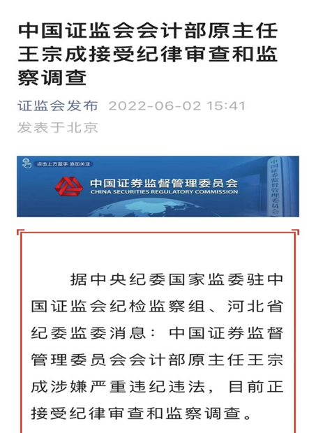 6月2日下午,中央纪委国家监委网站显示,据中央纪委国家监委驻中国证监会纪检监察组、河北省纪委监委消息:中国证券监督管理委员会会计部原主任王宗成涉嫌严重违纪违法,目前正接受纪律审查和监察调查。