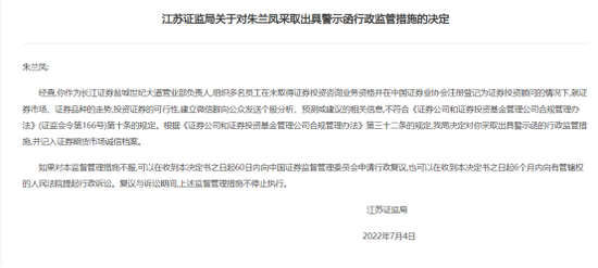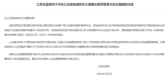 7月8日,江苏证监局向长江证券盐城世纪大道营业部下发3张监管罚单,对该营业部采取责令改正措施,同时也对营业部负责人朱某凤及合规人员何某采取出具警示函的监管措施。