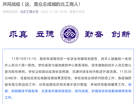11月20日,北京工商大学、北京工业大学相继通报相关疫情处置情况。