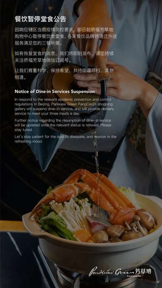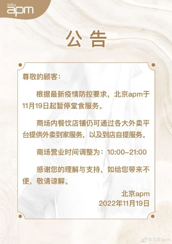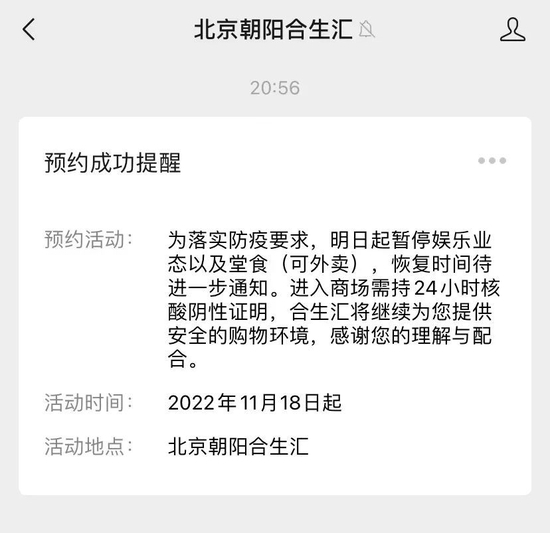 11月18日,北京朝阳合生汇发布通知,称“明日起暂停娱乐业态及堂食(可外卖),恢复时间待进一步通知。”