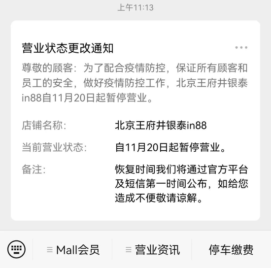 11月20日上午,北京王府井银泰in88微信公众号发布消息称,为了配合疫情防控,保证所有顾客和员工的安全,做好疫情防控工作,北京王府井银泰in88自11月20日起暂停营业,恢复时间将通过官方平台及短信第一时间公布。