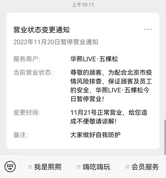 11月20日上午,华熙LIVE·五棵松微信公众号发布消息称,为配合北京市疫情风险排查,保证顾客及员工的安全,华熙LIVE·五棵11月20日暂停营业,11月21日正常营业。