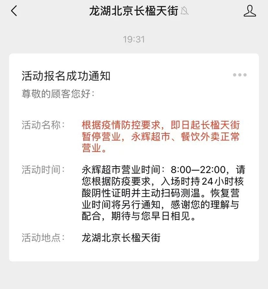 11月18日,北京长楹天街发布通知,称即日起长楹天街暂停营业,永辉超市、餐饮外卖正常营业。