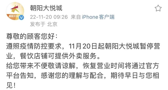 据@朝阳大悦城微博消息,遵照疫情防控要求,11月20日起朝阳大悦城暂停营业,餐饮店铺可提供外卖服务。