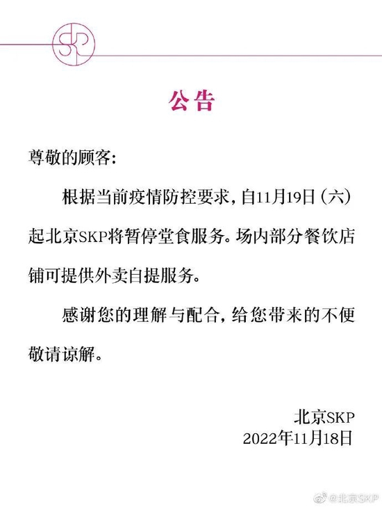 11月19日起,北京SKP将暂停堂食服务,场内部分餐饮店铺可提供外卖自提服务。