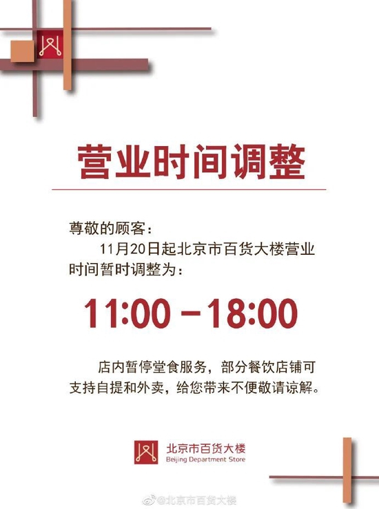 11月20日起北京市百货大楼营业时间暂时调整为:11:00-18:00