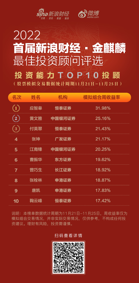 金麒麟投顾大赛模拟组合交易周榜:恒泰证券投顾应智皋周收益率31.98%居首位(数据周期11.21-11.25)