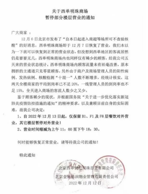 网传信息中还透露,鉴于顾客稀少的现状以及商场的实际困难,因此公司决定暂停部分楼层对外营业,恢复时间另行通知。该通知由北京西单世纪明珠百货有限公司和北京金地格润物业管理有限责任公司发出。