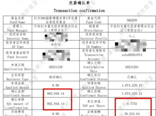 根据投资者晒出的图片,该名投资者认购的基金为幻方300指数增强欣享3号私募基金,2023年11月29日,该名投资者申请赎回,确认基金份额为107.42万份,确认金额80.28万元,基金的单位净值为0.7755元/份,每份净值亏0.2245元左右,该名投资者亏损了20万元左右,该基金还提取了3.02万元的业绩报酬。