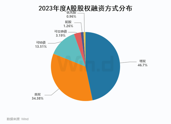 具体从各个融资方式来看,2023年IPO项目314起,募资规模为3,590亿元,占比为34%;增发301起,募资规模达4,876亿元,占比达47%;可转债135起,募资规模1,411亿元,占比为14%;配股4起,募资规模132亿元,占比为1%;优先股3起,募资规模100亿元,占比为1%。和去年同期相比,优先股融资事件增加3起,配股占比有小幅下降,其余融资方式占比与去年基本持平。