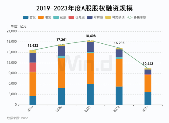 2023年度A股融资事件共786起,同比减少187起;股权融资总金额为10,442亿元,较去年同期下降36%。其中,IPO项目为314起,同期减少102起;募集金额为3,590亿元,同比下滑31%。增发项目301起,较去年同期减少62起;募集金额为4,876亿元,同比下降38%。配股项目4起,较去年同期减少6起;募集金额为132亿元,同比下降79%。