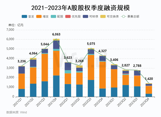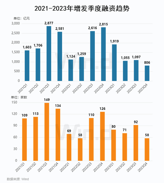 从增发融资近年趋势来看,受市场走弱背景影响,2023年增发整体融资规模大幅缩减,全年增发项目301起,较去年同期减少62起;募集金额为4,876亿元,同比下降38%。其中第四季度募资规模为806亿元,募资项目为58起,与前两年同期相比下滑明显。