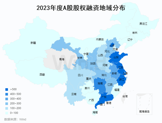 2023年度增发融资规模最高的区域为北京,募资金额达1,135亿元,共计30起项目。广东和浙江分别以784亿元和550亿元的募资额位居第二名和第三名,募资项目分别为58起和36起。