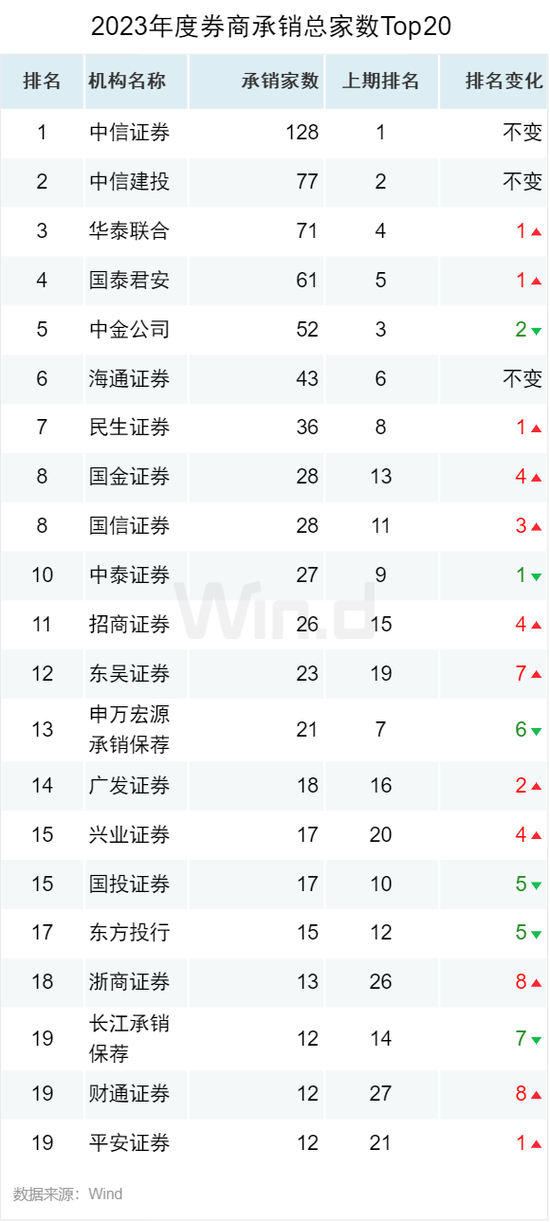 从券商承销数量来看,中信证券以128起承销数稳居榜单第一,中信建投以77起承销数位居第二,华泰联合以71起位居第三。此外,浙商证券和财通证券分别以13起和12起承销数进入榜单前20名,较去年均提升8个名次。