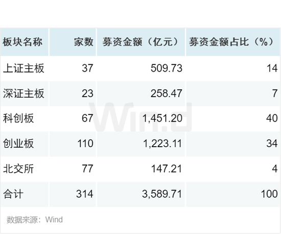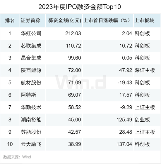 2023年度,IPO融资规模最高的为华虹公司,募资金额高达212亿元。募资规模前十项目里,科创板占据6席。