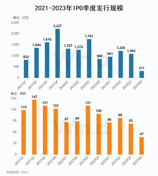 2023全年IPO发行314起,同比减少102起,募资规模为3,590亿元,同比下降31%。分季度来看,各季度数量分别为86起、98起、83起和47起,各季度募资规模分别为961亿元、1,226亿元、1,092亿元和311亿元,第四季度回落明显。