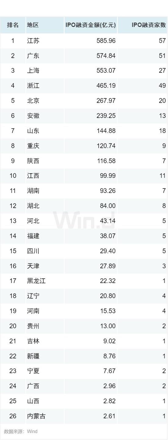 从地域分布来看,江苏以57起IPO募资金额586亿元居于第一,广东51起IPO募资金额575亿元排名第二,上海27起IPO募资金额553亿元排名第三。