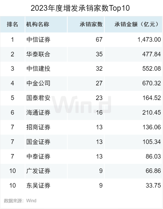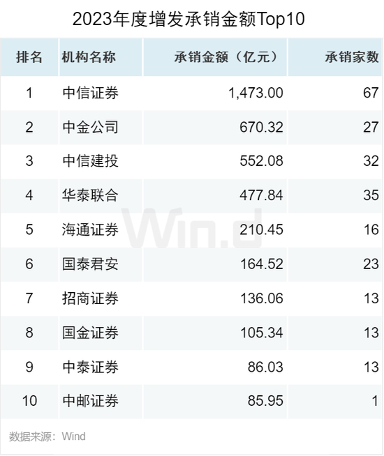从增发承销金额来看,中信证券以1,473亿元的承销金额位居第一;中金公司以670亿元的承销金额位居第二;中信建投以552亿元的承销金额位居第三。
