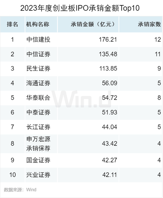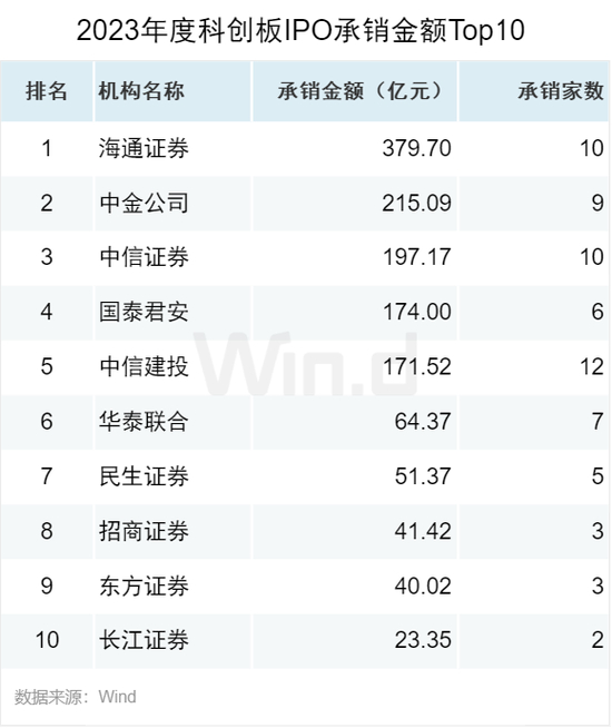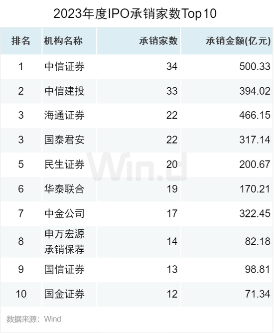 从IPO承销金额来看,中信证券以500亿元的承销金额位列第一,海通证券承销金额466亿元排名第二,中信建投承销金额394亿元排名第三。