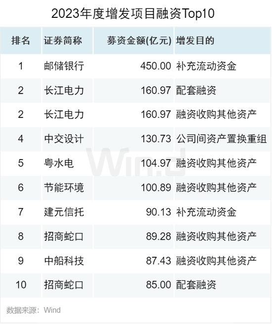 2023年度,增发募资规模最大的项目为邮储银行,募资额高达450亿元,本次发行用于补充流动资金。排名第二的融资项目为长江电力的增发项目,募资金额合计322亿元。前六名募资项目金额均达到百亿元以上。