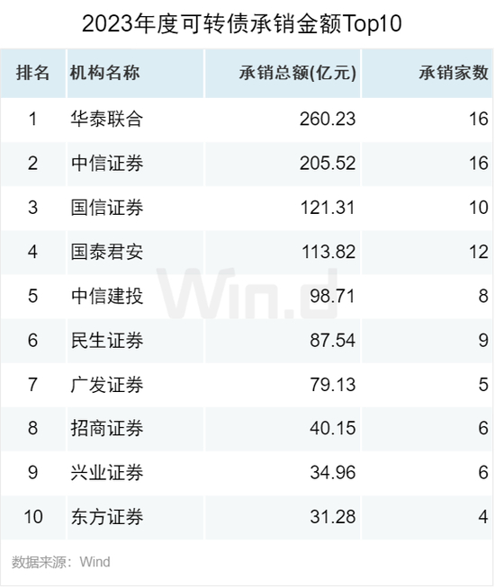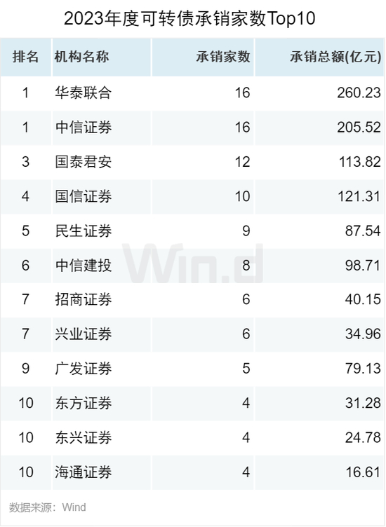 从可转债承销数量来看,华泰联合和中信证券以16起承销数量并列位居第一,国泰君安以12起位居第三。