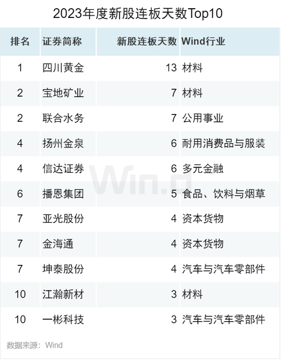 2023年度新股连板天数位居前三的为四川黄金、宝地矿业和联合水务,分别为13天、7天和7天。
