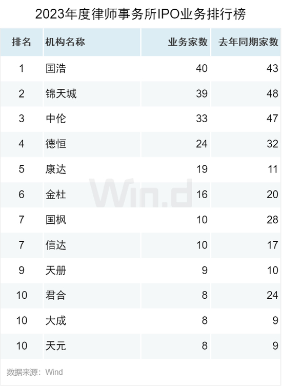 从律师事务所IPO排行榜单来看,国浩律师事务所和上海市锦天城律师事务所分别以40家和39家业务数位列一二名,紧随其后的是北京市中伦律师事务所,业务家数为33家。