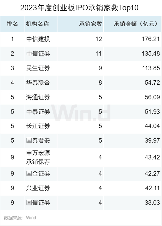 从创业板IPO承销数量来看,中信建投以12家承销数量位居第一,中信证券以11家承销数量位居第二, 民生证券以9家的承销数量位列第三位。