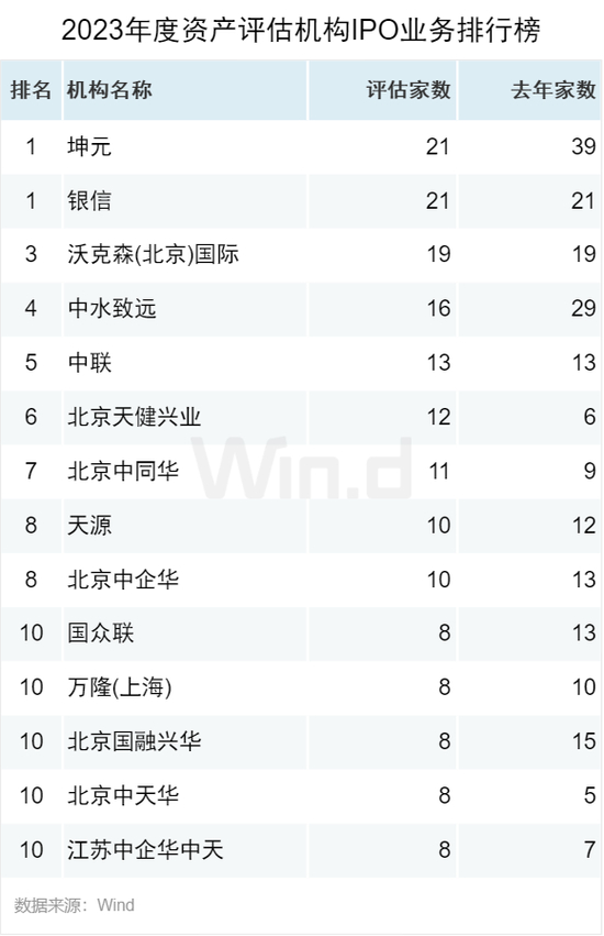 从资产评估机构榜单来看,坤元资产评估有限公司和银信资产评估有限公司以21家评估家数并列位居榜单第一;排名第三的是沃克森(北京)国际资产评估有限公司,评估家数19家。