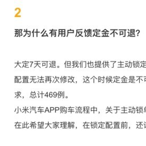 针对投诉,小米方面回应称:定金7日内支持无理由退款,超过7日后,车辆配置会自动锁定,消费者也可以提前主动锁定配置的。一旦订单锁定,车辆将进入生产阶段,配置无法再修改,定金不退。此外,创始版现车配置已经锁定,消费者在支付2万元定金后,即锁单。