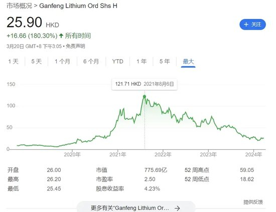 2018 年以来,赣锋锂业在港股的股价是一路飞升,从上市最初的不足 10 港元到巅峰时期达到 121 港元,市值更是超 2500 亿元;而其股价增长曲线最陡峭的 2021-2023 年正是公司密集对外投资的时期。