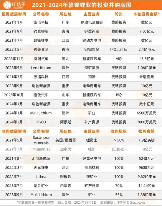 IT 桔子数据显示,从 2021 年至今的三年多时间内,赣锋锂业收购全球锂矿资产所花费的金额就达到了 105 亿元,再加上参与的其他投资,总体花费预计超越了 120 亿元。