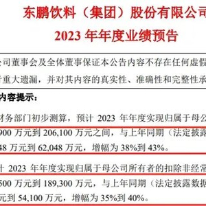 据公告数据,东鹏饮料预计2023 年年度预计实现营业收入110.57亿元到113.12亿元,同比增长30%到33%;净利润在 19.89 亿元到 20.61亿元之间,与上年同期相比,将增加 5.4848 亿元到 6.2048 亿元,增幅为 38%到 43%;预计 2023 年年度实现归母扣后净利润为 18.25亿元到 18.93亿元,与上年同期相比,将增加47,300 万元到 54,100 万元,增幅为 35%到 40%。