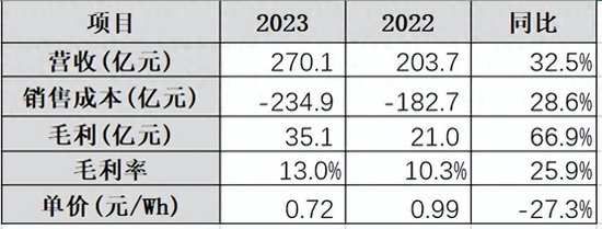 2023年中创新航营收达270.1亿元,同比增长32.5%,据SNE数据,中创新航全球动力电池机量33.4GWh排名第七,储能电池装机量4GWh,排名第十。总体来看,中创新航2023年装机量在37.4GWh左右,单价0.72元/Wh,较去年下降27.3%