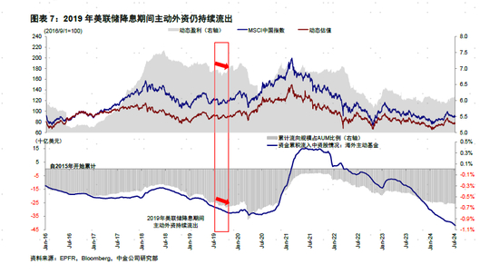 国内资金面上,外资流出扩大,南北向资金分化延续。截至本周三(7月11日-7月17日),主动价值型外资分别流出A股和港股市场2.5及4.3亿美元,较此前一周有所提速。尽管上周美联储降息预期升温,但港股市场的走势和外资流向却并没有体现出降息预期的“效果”,这也再次证明了我们的观点,即对于中国市场表现和外资流向而言,降息会有帮助,但也绝对最终决定的单一变量,国内政策和基本面更为重要(《降息周期中的港股》、《降息交易手册》),例如2019年美联储降息期间主动外资仍然持续流出,直到2020年中基本面明显改善后才大幅持续流入(图表7)。