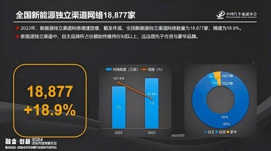 中国汽车流通协会《2023-2024中国汽车流通行业发展报告》显示:截至2023年年底,新能源建立的独立渠道为18877家,其中直营比例从2022年的22%增至2023年的30%。