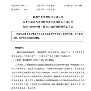8月17日,岭南股份公告称,中山市人才创新创业生态园服务有限公司正在筹划,不以谋求岭南股份股权为目的,收购部分“岭南转债”及其从权利相关事项。