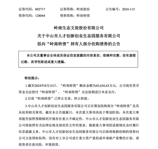8月17日,岭南股份公告称,中山市人才创新创业生态园服务有限公司(以下简称“中山人才生态园公司”)正在筹划收购部分“岭南转债”。