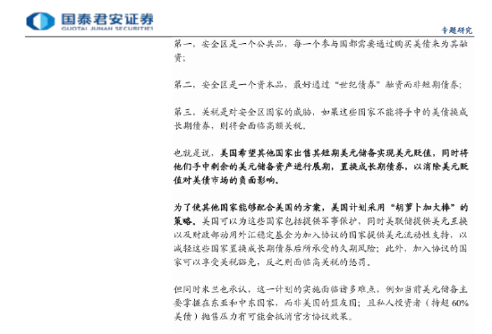 1)在多边货币协定中,美国与其他国家共同构建一个美元“安全区”,其他国家出售其短期美元储备实现美元贬值,同时将他们手中剩余的美元储备资产进行展期,置换成“世纪债券”,以消除美元贬值对美债市场的负面影响;美国会为承担久期风险的外国投资者提供美元流动性支持,否则将面临高额关税。